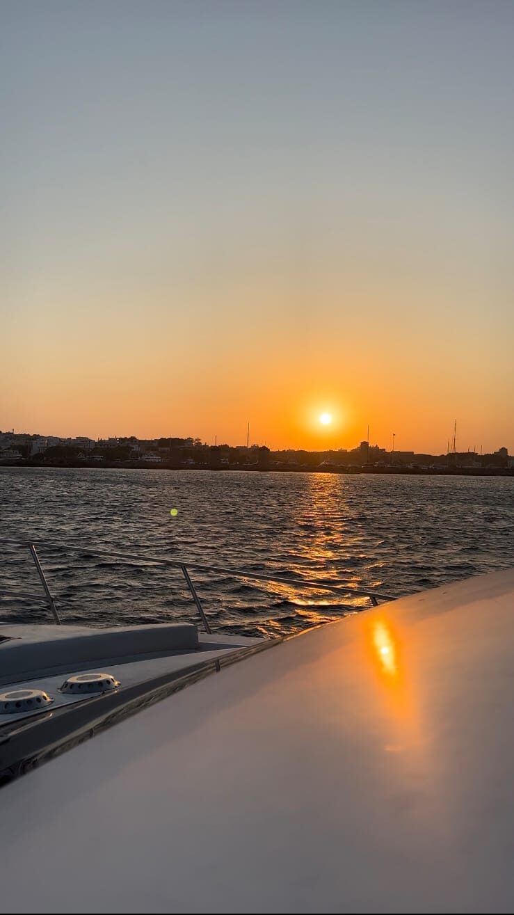 We start with a refreshing swim stop at Kalithea Springs in crystal-clear waters, followed by a smooth cruise towards the best spot to watch the sun set over the horizon.